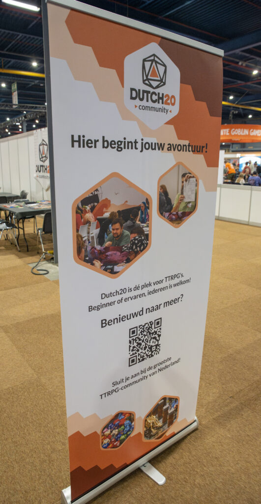 En natuurlijk kun je bij de Dutch20-stand langskomen om je in te schrijven voor een leuke oneshotsessie, te kletsen over alles omtrent TTRPG en om een rol te wagen met onze super speciale enorme Dutch20-D20-dobbelsteen!